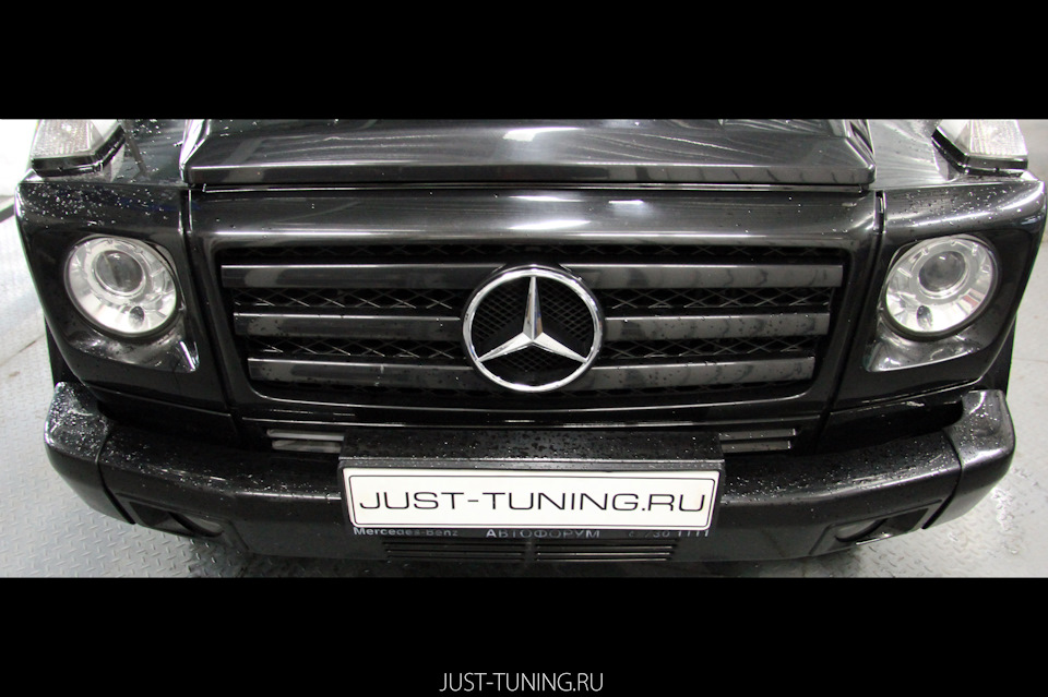 Нам привезли G500 в кузове w463, внешне автомобиль был полный сток с затертым некачественными и частыми мойками лакокрасочным покрытием. Задача — добавить немного внешнего стиля и заставить его блестеть, как будто он только выехал из салона.