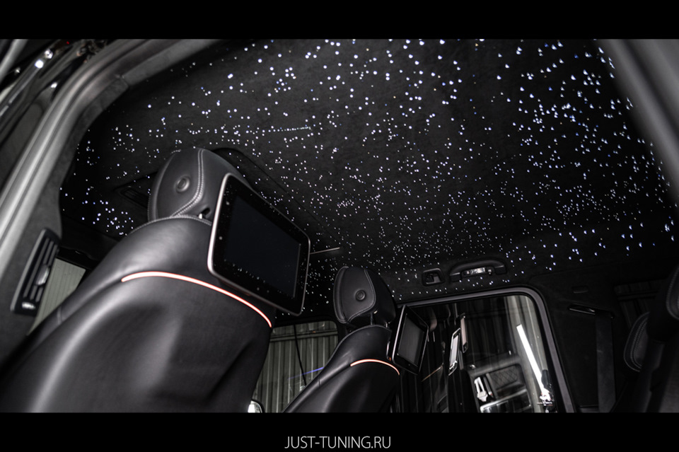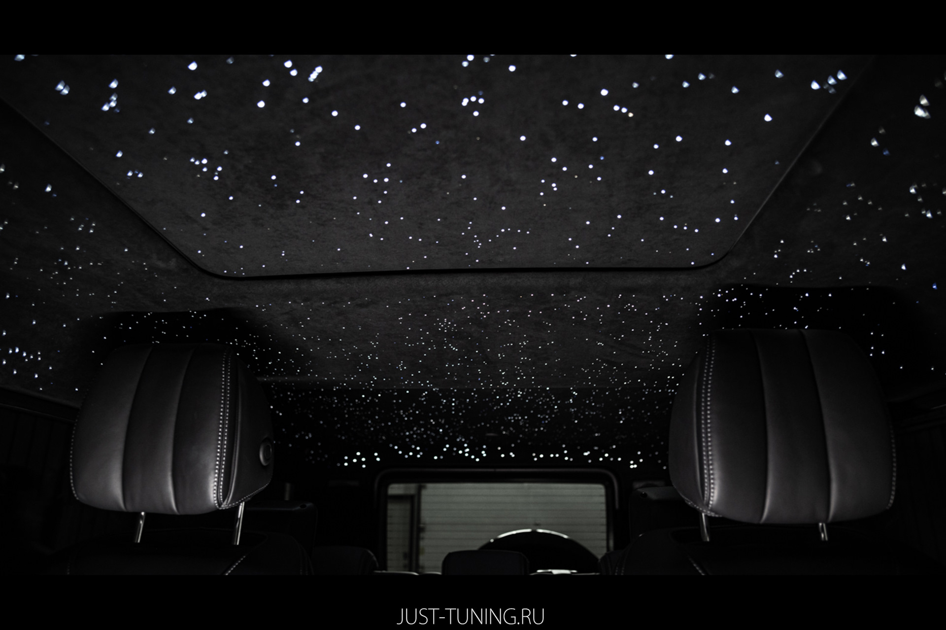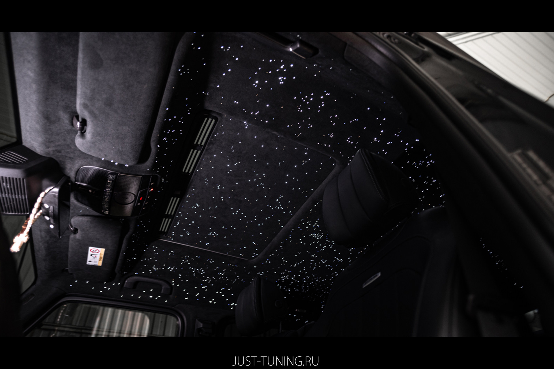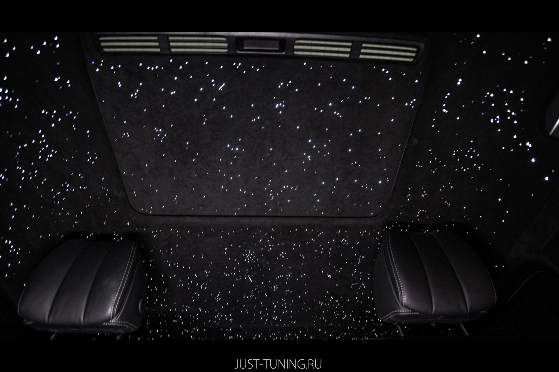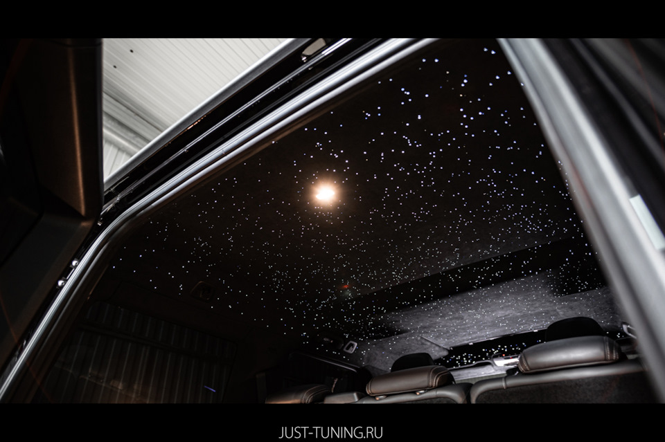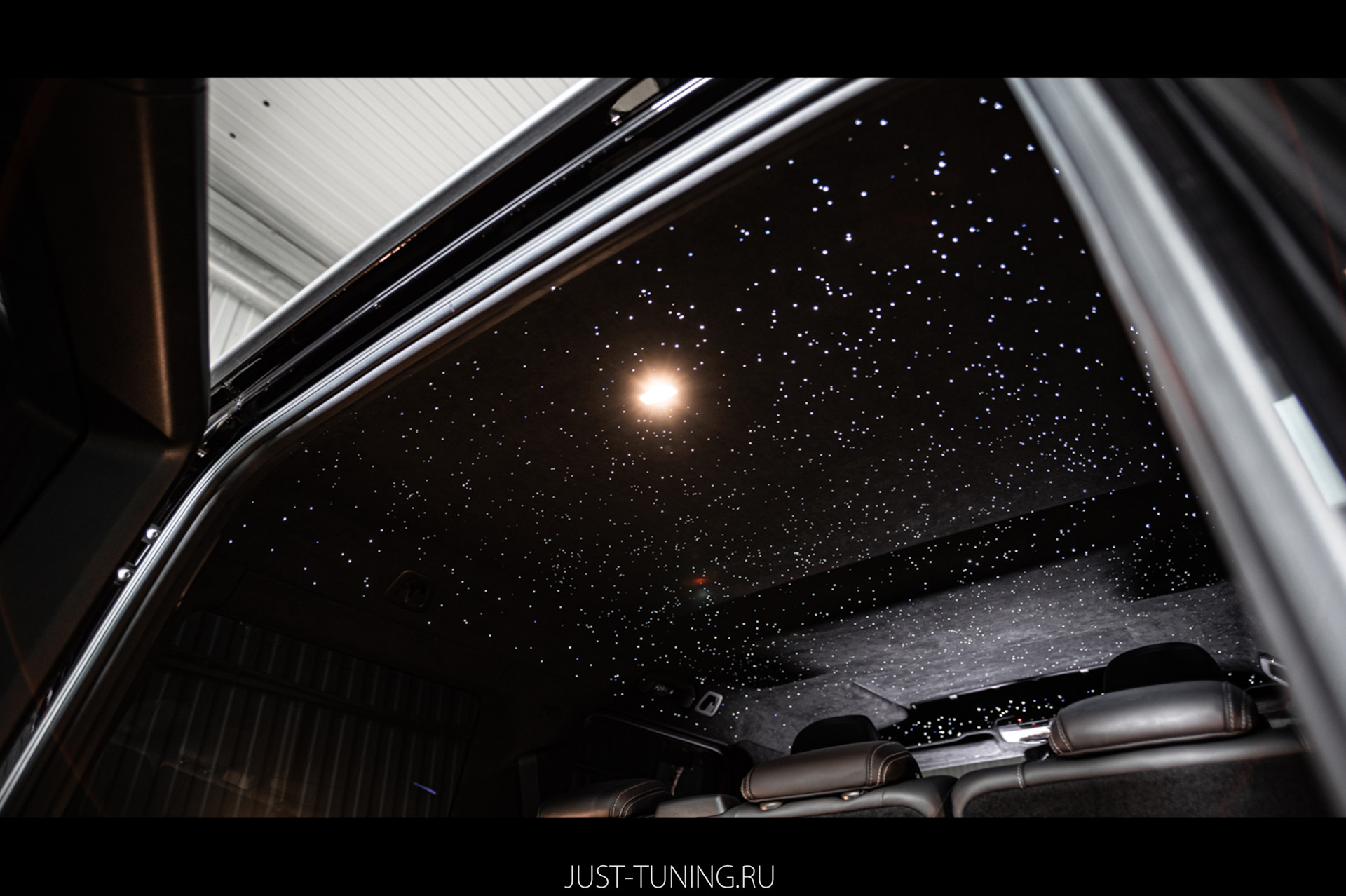 Во-первых, установили звездное небо со следующими характеристиками: 2800 звезд, 8 комет и 12 созвездий! Звезды расположены на всей плоскости потолка, включая люк, функционал люка само собой сохранен. Включить/выключить звездное небо, изменить яркость и скорость мерцания можно с кнопок, расположенных на панели слева от руля (мы дооснастили эту панель дополнительными кнопками, на которых предварительно сделали гравировку).